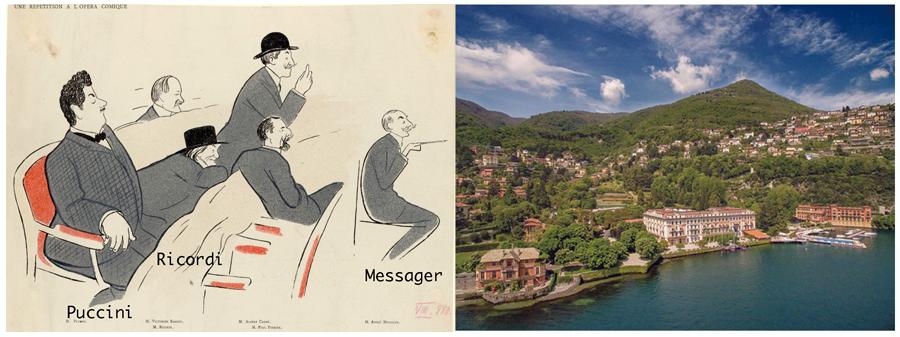 Henry Février, one of Messager's disciples, described Messager as "my teacher and good friend" in his writing in 1948. According to his writing, Messager and Puccini stayed in Villa d'Este by the lake Como in Italy. There, Messager composed "Madame Chrysanthème," and Puccini composed "Manon Lescaut". Giulio Ricordi, President of music publisher Ricordi in Milan, arranged their stay. Back then, Messager was already a prominent musician in France, having served as the leading conductor at the Paris Opera Comique. Puccini was still a young, rising composer before publishing "Manon Lescaut". What was remarkable was that Leoncavallo's "Pagliacci" was performed in May of the same year in Milan for the first time, and earned positive reviews. "Pagliacci" was published by Sonzogno, Ricordi's competitor publisher. Giulio Ricordi staked his company's future on Puccini's talent and performance in Paris. This was why he invited Messager and Puccini to Villa d'Este together. Both composers played their new music scores on the piano. Probably, they also studied "Pagliacci" which had its premier few months back. Consequently, "Madame Chrysanthème" and "Manon Lescaut" have some parts clearly influenced by "Pagliacci". Also, the Flower Duet in "Madama Butterfly" has clear influence from the duet by Okiku- san and Oyuki in "Madame Chrysanthème". Their stay in Villa d'Este in that summer was a historically important event. As a side note, there is a sketch of rehearsal in the Paris Opera Comique in 1906. It depicts the conductor, Messager, with Puccini and Giulio Ricordi. The three were business partners. Puccini was already a member of great composers.