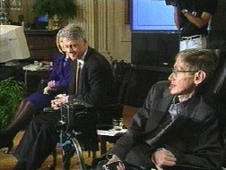 ホーキング博士はご存知のように、車椅子の天才宇宙物理学者として世界的に有名です。 ケンブリッジ大学でエイトのコックもつとめた快活な若者は、筋萎縮性側索硬化症と診断され、歩くことも話すことも出来なくなりました。しかし当初2〜3年といわれた彼の病状の進行が遅れて研究の意欲を取り戻した彼は、宇宙のはじまりには特異点が存在するはずだという「特異点定理」を発表、それまでの宇宙物理学を大きく変え、1974年には史上最年少の32歳でイギリス王立協会会員となり、ケンブリッジ大学のルーカス記念数学教授職につきました。このポストはかのニュートンが占めていた要職です。