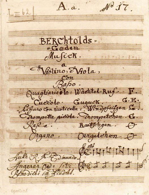 「Berchtolds-Gaden Musick」はベルヒトルツガーデンムジークと発音します。この『おもちゃの交響曲』に使用される木製玩具の名産地であるベルヒテスガーデンの音楽という意味の造語と思われます。そして、この「ベルヒテスガーデン音楽」を銘打った楽譜は、このアンゲラーの楽譜だけです。