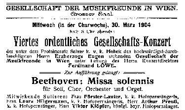 モーツァルテウム音大の図書館で借りた楽譜に挟まっていた1904年のウィーンフィルの定期演奏会のプログラム。曲はベートーヴェンのミサソレムニス、指揮はマーラーと同じ頃活躍したフェルディナンド・レーベ。