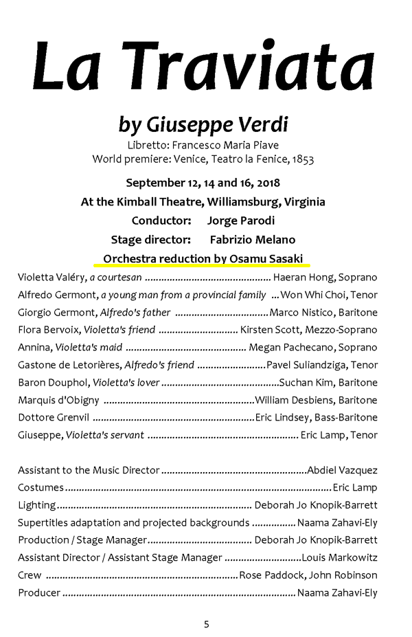 2018年私の編曲したヴェルディ「椿姫」(室内楽版)がアメリカ・ヴァージニア州ウィリアムズバーグで上演されました。