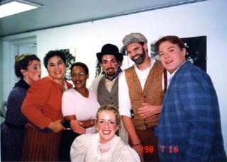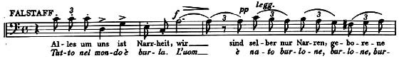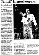 クイックリー夫人は豊かな声(lushvoiced:豪勢な、賛沢な、溢れんばかりの)の日本人マキコ・ナルミによって演じられた。彼女は、サー・ジョン(Sir=騎士につけられる敬称、この場合ファルスタッフのこと)のもとを訪れ“御免下さいませ”と言う度に”ご挨拶の印”として腰をふっていた。 才能溢れるアイルランド出身のソプラノ、モイラ・オブリアンは魅力的で賢いアリス・フォードを演じ、またその夫役を印象深く、明るい声のアフリカ系アメリカ人のバリトン、シェーネン・ディヴインが演じた。 (アスペンオペラ劇場) ボンベイ出身のテナー、ソラブ・ワディアはバリトンのジェイ・マクマナス演じるピストーラと共に、赤鼻のバルドルフォ役で好演。メゾ・ソプラノのジェー・ダイアモンドは少女の様なメグ・ぺ一ジ役を、ソプラノのジェニー・エルマーはナンネッタ役には強すぎる声だった。また、テナーのジェムス・ブラウンはその恋人役、フェントンとしては声が少し明るかった。 演出家はファルスタッフに2回ズボンのファスナーを開けさせたまま登場させ、音楽のタイミングに合わせて、ファスナーを閉め直させたが、演出家が意図したほどのおもしろさを感じさせなかった。 2幕のクライマックス、ファルスタッフがテムズ川にほうりこまれる場面では、ファルスタッフが隠れているはずの洗濯籠が不器用に引きずり運ばれた為、洗濯籠が空になっているのが解り、太った男(ファルスタッフ)がもはや籠の中にいないことは明らかだった。先ほどまで中庭の場面で見せていたファルスタッフの偉大さが欠け、恐怖感よりかわいらしさを感じた3幕では、オークの大木が無く、ファルスタッフも彼の機知を駆使した冗談を言う場面になるまで恐怖におののく感じが欲しかった。(台本上ではこの大木の存在が大変に重要視されているからあえて書いていると思われる。今回の公演では一枚の大きな葉を設置して、大木があることを暗示する方法をとった。)しかし以上の事柄は大いに楽しんだ後のささいな揚げ足取りであって、全体としては大変に良く歌えていた公演だった。 ![]()