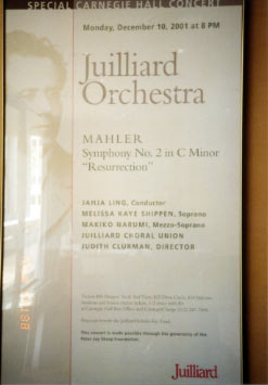 | 謹啓 当地青森も日一日と緑の美しい季節となりました さて、予てから話しになっていました鳴海真希子賞の受賞者が正式に決まり、その授賞式と演奏会が2006年5月12日、13日ジュリアード・スクールで行われました。 私どももご案内をいただき出席してまいりました。受賞されたイザベラ・レナードさんは23歳、メゾ・ソプラノの方です。真希子のことを知っているということで、真希子も喜んでいると思います。 授賞式には学長を始め、ジュリアード・スクールの関係者や、生前真希子を応援してくださっていた方々が出席され、真希子の思い出を語ってくださいました。 この写真は、学長の部屋に飾られている、真希子の出演したカーネギー・ホールでのマーラー『復活』のポスターです。ポリージ学長は毎朝このポスターを見て、真希子を偲んでいると話されていました。 これからの受賞された方々の演奏会に毎年出席するのは難しいと思いますが、できるだけ出席したいと考えております。 嬉しいお知らせを報告いたしたくお便りしました。 最後になりましたが、皆様のご健康をお祈りいたします。 敬具 鳴海 秀 |