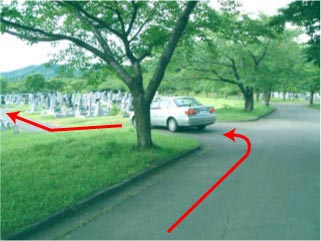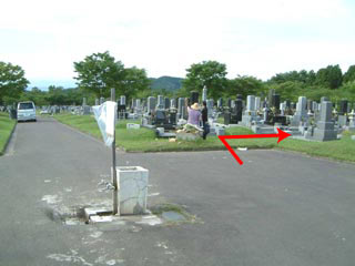 車で来た方向を背に、矢印の右の列、8番目ほどにお墓があります。
