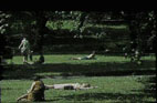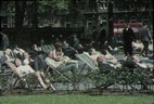 公園で有料ベンチで陽をあびる人達 ガス灯のある通り