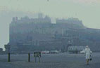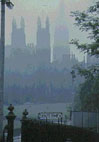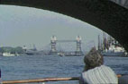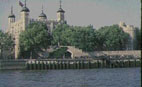 テ−ムス河からみたロンドン橋とロンドン塔 この中に宝物殿があり、王冠があり、塩の入れものがあった