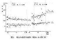 図1はその1は41歳から62歳にかけての血圧の推移を示すが、血圧水準として最高血圧115mmHg、最低血圧61mmHgで、1年間に最高血圧については0.72mmHg下降し、最低血圧については0.10mmHg上昇の傾向のあることを示す。その2はそれぞれ149mmHg、75mmHgの血圧水準であり、1年間にそれぞれ2.70mmHg,0.56mmHg上昇する傾向のあることが認められた2)。