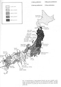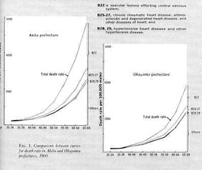 Observations@of mortality rates from apoplexy, the most dominant cause of death, have to revealed extreme regional differences in Japan. The authors previously investigated the regional differences in mortality from apoplexy in Japan.2) Comparative investigations were made on mortality classified by age between the Akita prefecture, showing the highest mortality from apoplexy in the northeastern district where the mortality was generally high and the Okayama prefecture in the southwestern district where the mortality was low(Fig.1, Table 1).