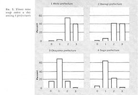 In the acutal daily life, Japanese people take miso in miso soup at meals, and regional differences were noted in the salt concentration of miso soup.17) Sample of 3,578 kinds of miso soup were collected and analysed from 4 districts: Akita predecture in the northeastern disrict, the Ibaragi prefecture where the mortality from apoplexy was high, the Okayama prefecture where the mortality was low, and the Saga prefecture where it was relatively high. Miso soup contained 1.5% of salt in the Akita prefecture, 1.63% in Ibaragi, 1.44%, in Okayama, and 1.47% in Saga. The average was 1.51%. As to a frequency of miso soup consumption, it was quite different@with districts(Fig.3, Table 3).