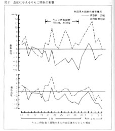 りんごを食べると人の血圧がどのように変わるものか実験してみたいと思った。 人体実験である。「でも、りんごをただでもらえるのだから」とこの調査にはすぐ協力が得られた。