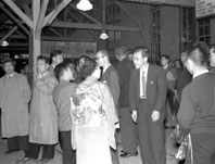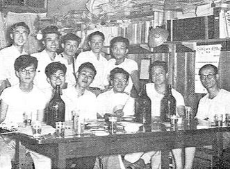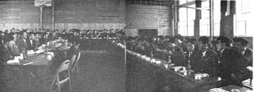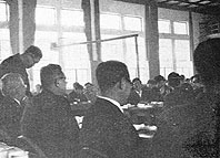 学友会主催の卒業生を送る会が大講堂で行われたときのものである。卒業生を中央に、3年生以下がとりかこむように座った。アルバムにわざわざサイダ−でないと書いてあるのをみると、立っている瓶はお酒のようである。 但し女性の方にはジュ−スと書いてある。