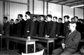 写真1は昭和33年4月の進学式の風景である。37年卒8回生が医学部専門に上がってきたときのもので、場所は旧校舎の学1の講義室であった。当時の学生はほとんどそろいの学生服というものを着ていたものだ。一人宣言をした浅倉礼治君は背広姿が目立っていて、近頃の学生は背広など着てといった教授に、これが私のいた学校の制服でしてと答えたことが耳に残っている。