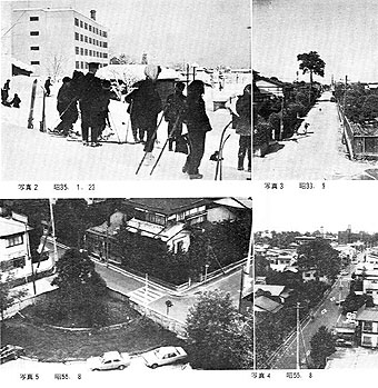 昭和35年1月23日撮影。場所は旧図書館の前の坂。34年にたった新病棟とその手前の動物舎。この小さな坂で、休み時間に、スキ−をやった人もあるだろう。