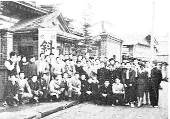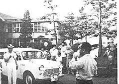 医学部に自動車部ができて、いよいよ日本一周へ出発することになった日のものである。この際のメンバ−は、浜田、鈴木(公)、橋本、外間、鈴木(重)、佐藤、疋田の七名で、その雄姿は鵬桜会報30号記念号に掲載した。写真は部長の山本教授の音頭でビ−ルで乾杯という時にシャッタ−をおした。但し選手は”のまなかった”とアルバムに書いてある。(21号その11から)