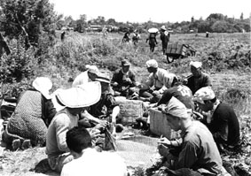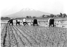 岩木山を背に田植えをしている方々、そして昼に車座になってたのしい食事をとっている人たちに「先生一つどうです」とさそわれたことがあります。
