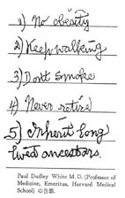 疫学のテンデイ・セミナ−に参加された順天堂の牧野毅博士がレセプションで八十歳をこしたホワイト博士に「長寿の秘訣」をたずねたら、手帳に一から四まで書かれ、後に五は思いだしたからといって付け加えられたという思い出を「心臓」の海外だよりに書いている。