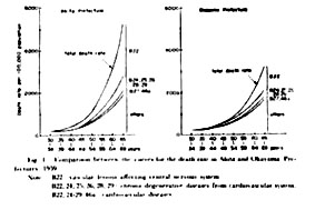 Comparative investigations were made on mortalities classified by ages by vital statistics between Akita Prefecture showing the highest mortality from apoplexy among the north-easten distict where the mortality was generally high and Okayama Prefecture in the south-western district where the mortality was low (Fig.1).