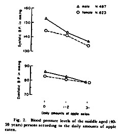 Blood pressure of 38 middle aged men and women of an agricultural village in Akita Prefectire was measured everyday for a month9). After the second week, the blood presuure decreased signignificantly in 18 of them in whom an average of 6 apples were given a day in consumption to them who did not eat apple. Measurement of K and Na in urine in those 2 groups proved that the Na/K ratio decreased after eating apples.