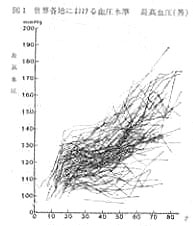 血圧水準を国際的に比較するときには、血圧測定方法の基準が統一されていないことが問題となるが、世界各地で行われた各種人口集団の調査報告のうち、性別・年齢別の血圧平均値を知ることのできる報告をあつめたところ、男性の最高血圧について図1に示すようになった。