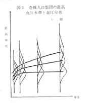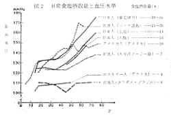 図2は主な例を示したが、一般に文明化した社会においては食塩摂取量は10g程度であり、血圧水準は若い時から高い。日本における例として、大阪、広島および東北地方の住民の血圧水準と食塩摂取量が示されている。東北地方では一日一人当たり20gの食塩摂取はごく普通にみられるのである。このような食塩摂取と血圧水準との関係は、さらに国際的な調査研究によって確かめられる必要がある。
