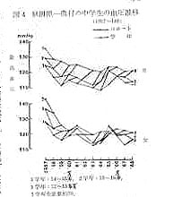 さらに興味のあることは、同じ村の中学生の血圧の推移である。図4は入学年別・コホ−ト別に、又同じ学年の血圧の推移が示されている。発育と共に血圧は上昇するが、その水準は初めの5年間に低下を示した。この中学生の身長とか体重からみた発育状況は向上しているので、栄養状況が悪くなったためではない。高血圧対策の中心になった食塩摂取の減少による影響ではないかと考えられるのである。